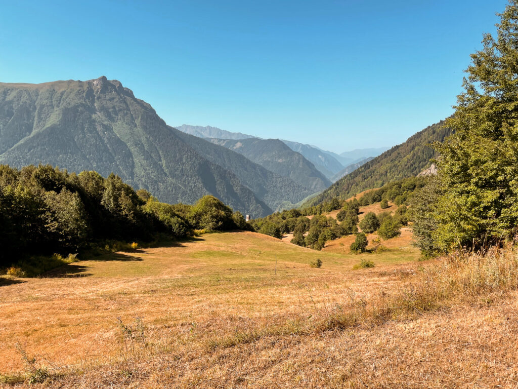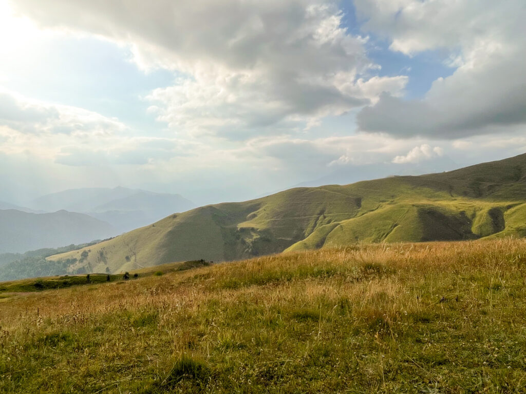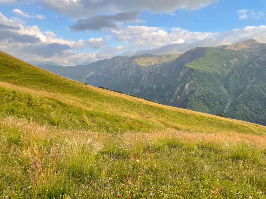 In a nutshell, we combined two days of the traditional route into one day. Read my post on hiking from Mestia to Ushguli for the full description of this day. The first half of the day’s hike is relatively flat passing through villages along a round. The second half is the interesting part – we took the high route which brings you above the tree line and lets you descend into Adishi with the sunset.